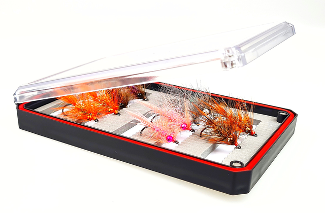 FutureFly Mojn Fliess assortment er et utvalg med 10 stk sjøørretfluer fluer i Mojn flueboks med klart lokk.